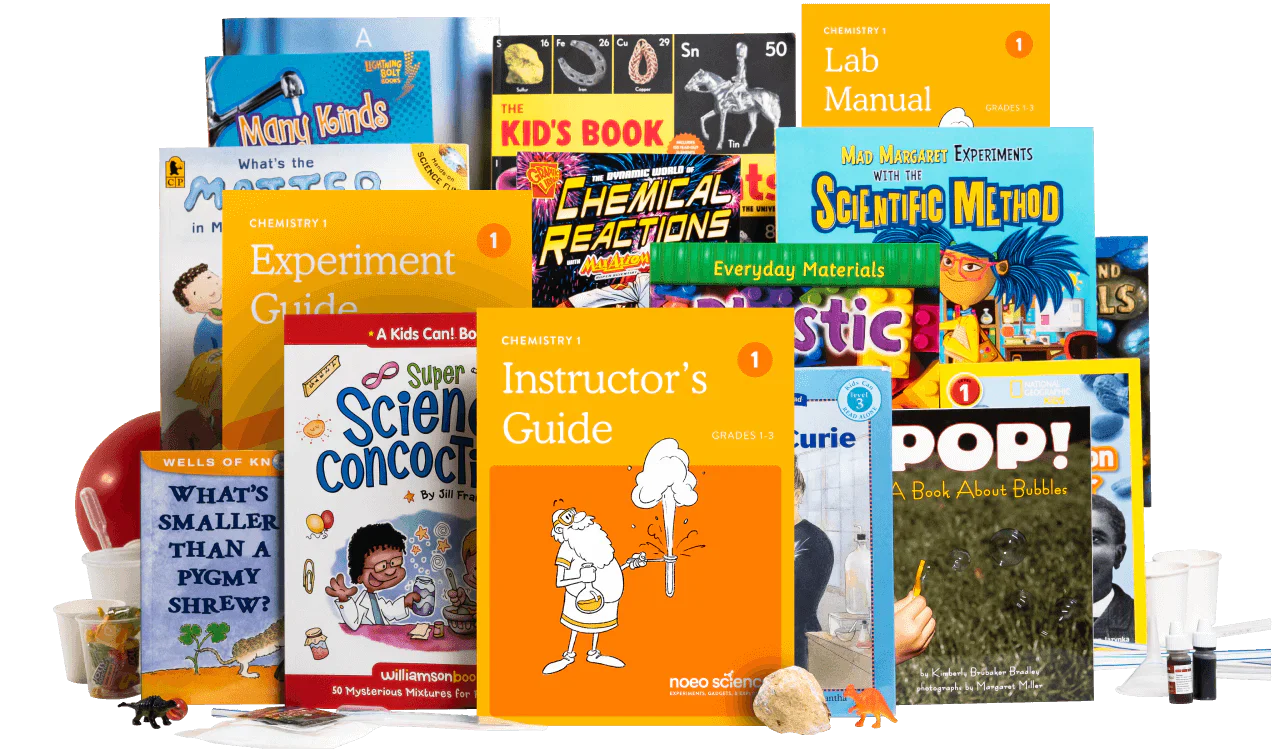 Noeo Chemistry 1 guides your child through an exciting first exploration of the world of chemistry. We’ve packed your Noeo box with all the books, lesson plans, and experiments you need to turn your home into a science lab on day 1.
